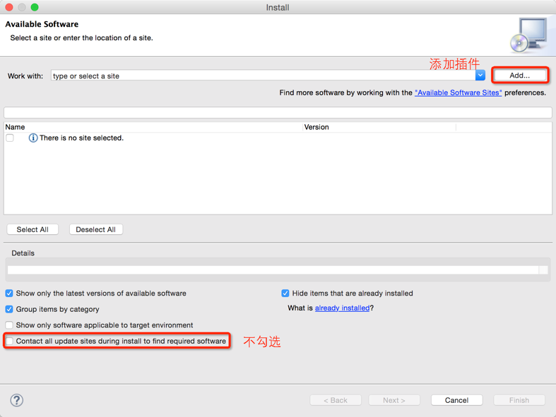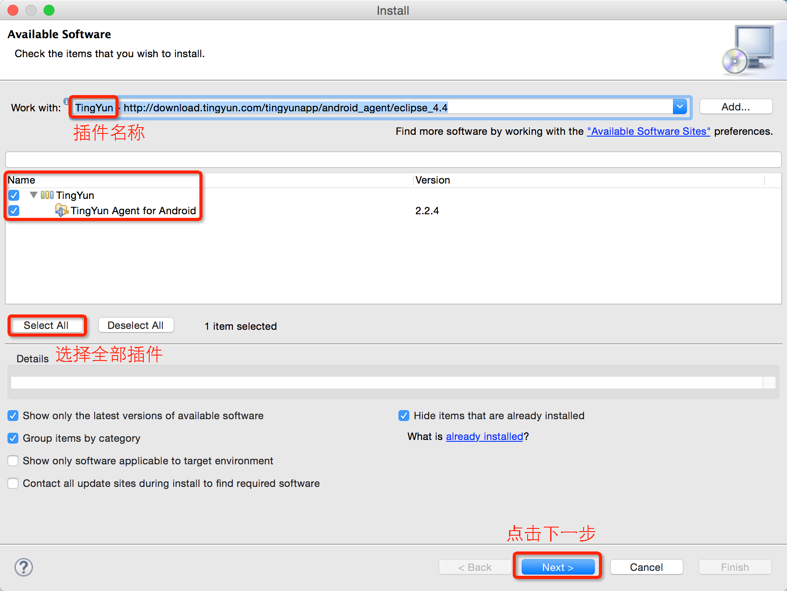 IV. В поле “Work with” выберите добавленный репозиторий. В списке ниже нажмите “Select All”, чтобы выбрать все плагины. Нажмите “Next >”, чтобы продолжить.