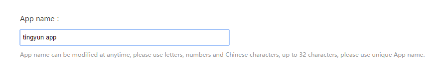 Имя приложения может содержать буквы, цифры и китайские иероглифы, максимальная длина - 32 символа. При задании имени приложения рекомендуется избегать повторяющихся названий, чтобы не создавать ненужных сложностей.