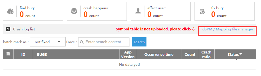 ii. Справа в “crash history record list” выберите и нажмите “dSYM / Mapping file management”.