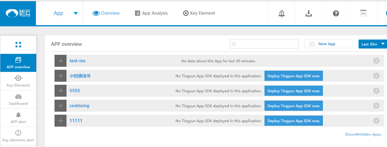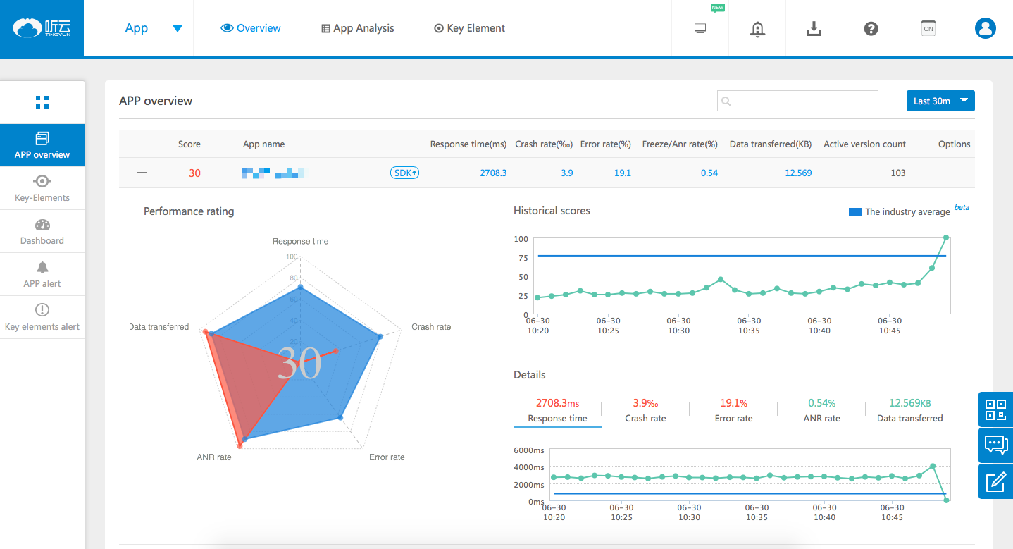 Обзор приложения по умолчанию оценивает текущее приложение на основе следующих показателей: HTTP-время отклика, уровень сбоев, уровень HTTP-ошибок, уровень сетевых ошибок. На основании этих показателей выполняется комплексная оценка производительности текущего приложения. С помощью контроллера времени можно просмотреть рейтинги производительности всех приложений за необходимый период времени с помощью элемента управления временем.