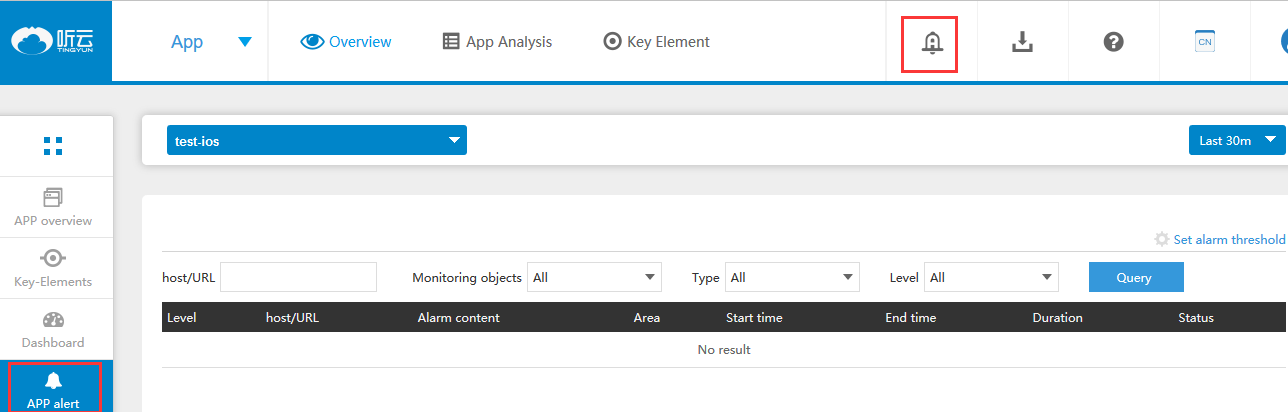 1、На странице обзора (например, Altynview App) нажмите App Alerts или Key Element Alerts, чтобы просмотреть записи оповещений.