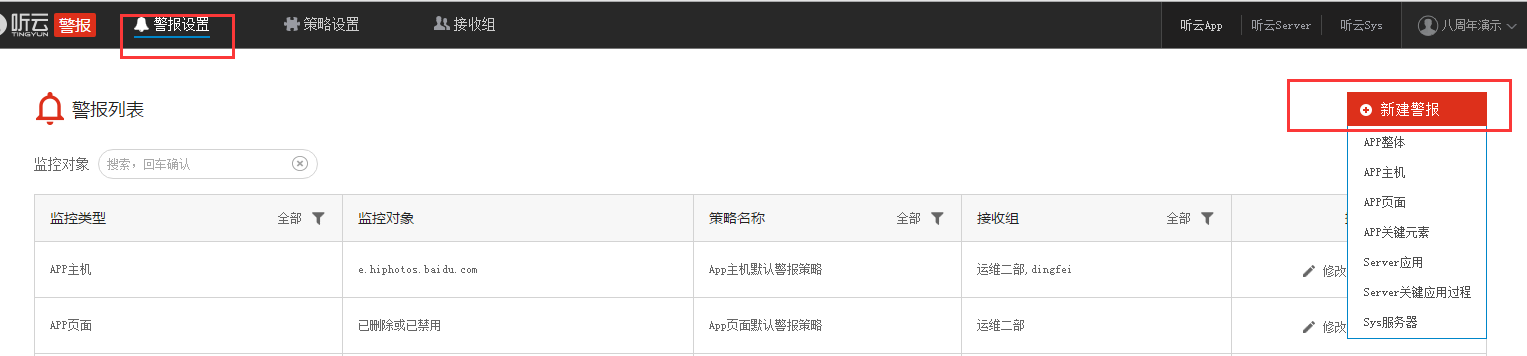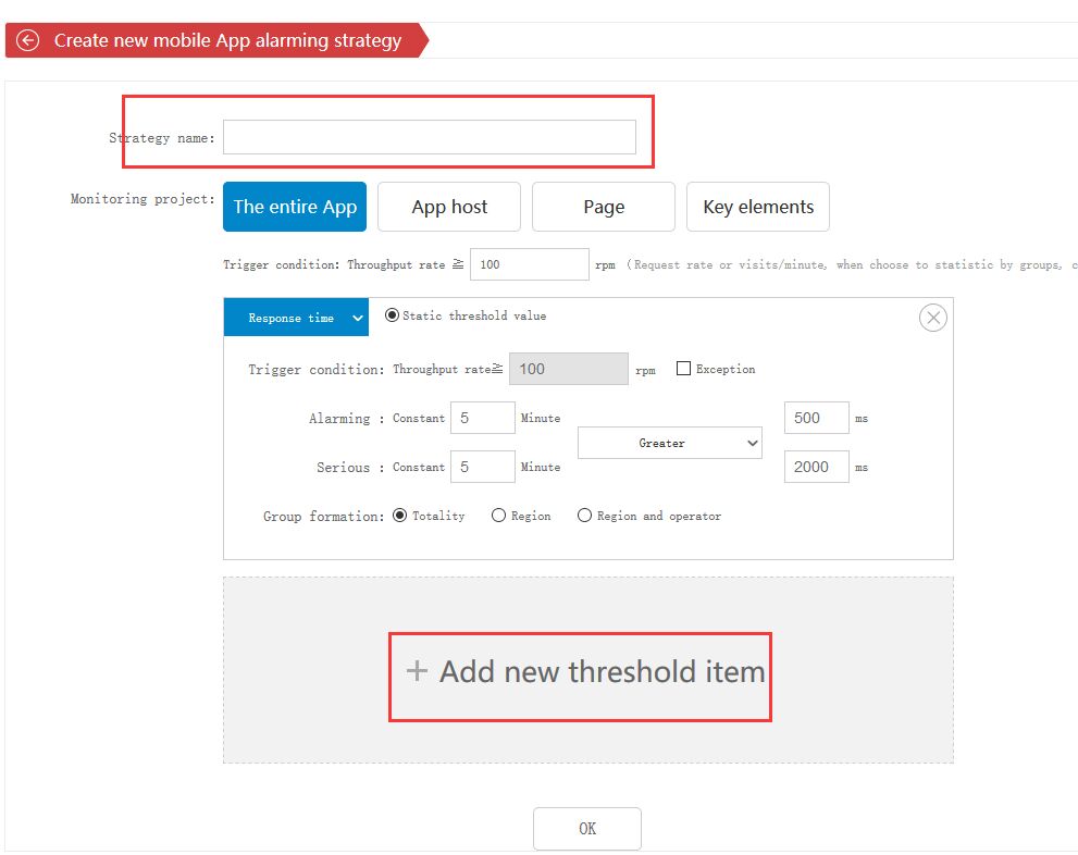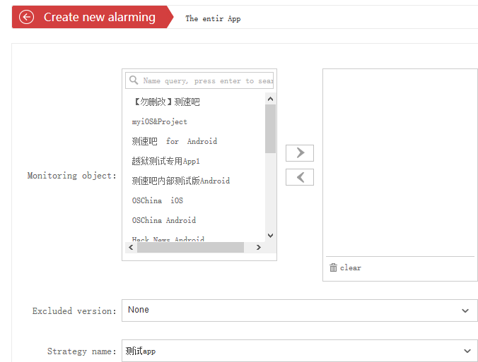 2、В качестве примера возьмём App Alerts. Укажите название стратегии и выберите объект мониторинга. В соответствии с вашими требованиями заполните остальные параметры. Поддерживается настройка нескольких пороговых значений. После заполнения нажмите «Сохранить».