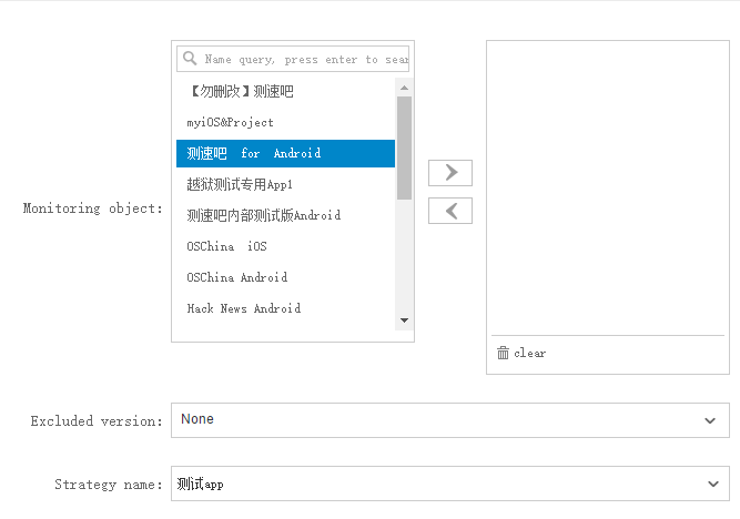 Объект мониторинга: слева отображаются все объекты мониторинга на выбранном уровне оповещений. Например, при выборе entire APP слева показывается список всех App в текущей учётной записи. Переместите нужный объект вправо, чтобы добавить его к мониторингу.