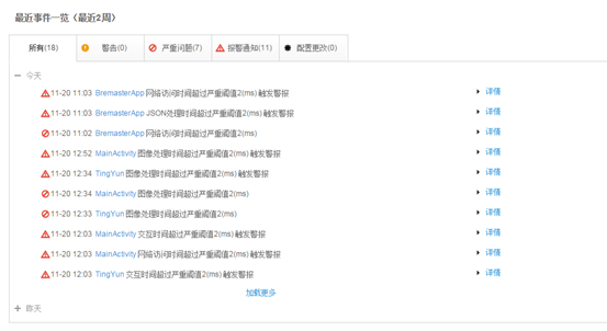 Отображает события оповещений за последние две недели, не выделяя отдельные элементы мониторинга. События оповещений включают предупреждения, критические события и уведомления об оповещениях. Для просмотра подробностей нажмите [«Подробности»] (Details). Здесь также можно увидеть изменения в конфигурации.