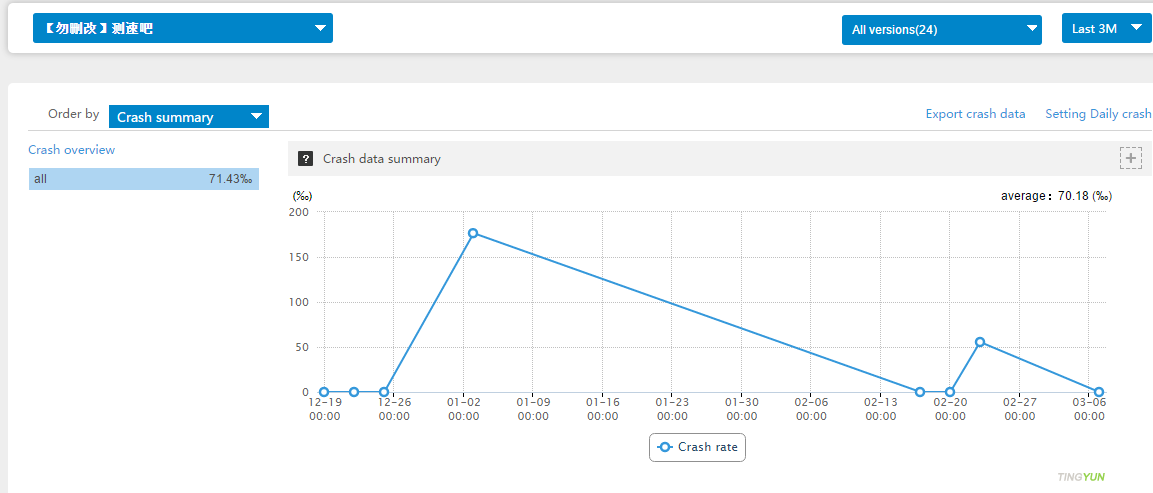 Сбои: Для анализа сбоев предоставляется четыре измерения: сводка по уровню сбоев, распределение по версиям, распределение по устройствам и распределение по операционным системам. Это позволяет выявлять версии и модели устройств с наибольшей частотой сбоев, а также целенаправленно оптимизировать тестовые программы (например, закупать устройства с наибольшим уровнем сбоев) и управление бизнесом по четырём уровням: количество ошибок (Bug), количество сбоев, количество затронутых пользователей (одно устройство считается одним пользователем), количество исправленных ошибок (чем больше пользователей затронуто, тем ниже пользовательский опыт).