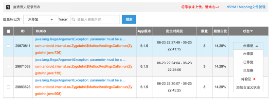Список истории сбоев: Агрегация выполняется по версии приложения, типу сбоя и первой строке пользовательского стека сбоя. Сортировка осуществляется по текущему коэффициенту сбоев ошибки (текущее количество ошибок/общее количество ощибок). Панель состояния справа позволяет пользователям добавлять три пользовательских состояния (до 6 символов каждое) для более удобного управления ошибками.