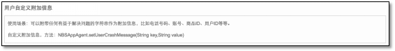 Method:NBSAppAgent.setUserCrashMessage(String key,String value);