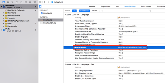 Далее выберите: Project → TARGETS → Build Settings, найдите раздел Apple LLVM 6.0 - Language, в котором есть параметр Prefix Header, дважды щёлкните по нему и введите «имя проекта / имя pch-файла». На этом настройка pch-файла завершена.