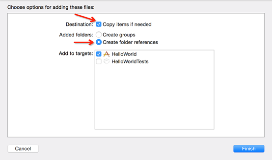ii. В появившемся диалоговом окне Xcode, выберите “Copy items into destination group’s folder” (Скопировать элементы в папку целевой группы) и “Create folder references for any added folders” (Создать ссылки на папки для всех добавленных папок), и подтвердите действие.