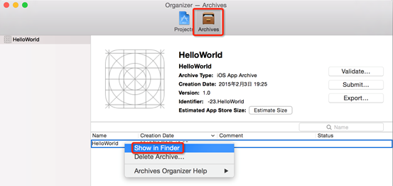 ii. Перейдите в раздел Archives, найдите целевой проект, щёлкните по нему правой кнопкой мыши и выберите Show in Finder, чтобы открыть каталог файлов.