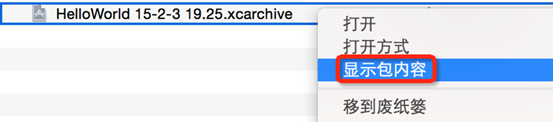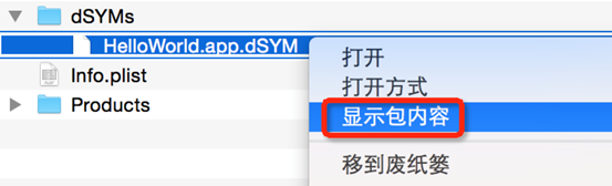 iv. Найдите соответствующий файл .app.dSYM, например HelloWorld.app.dSYM, щёлкните по нему правой кнопкой мыши и выберите Show Package Contents.