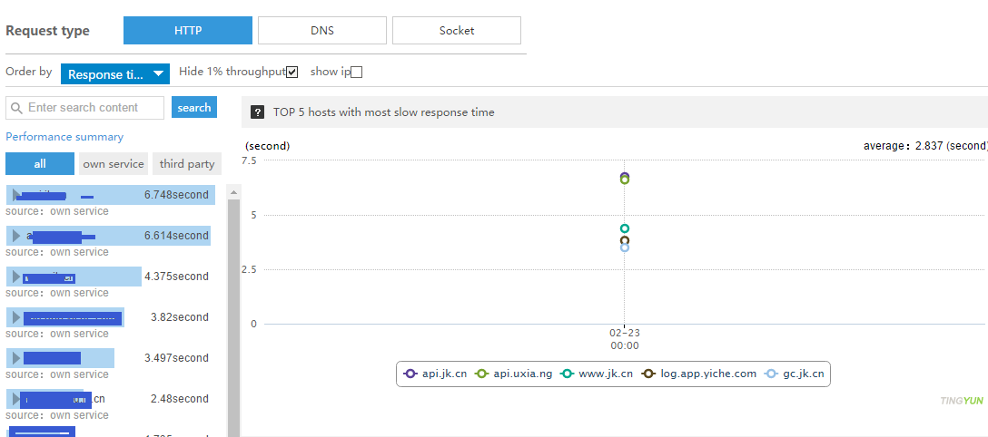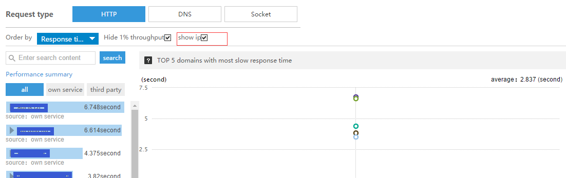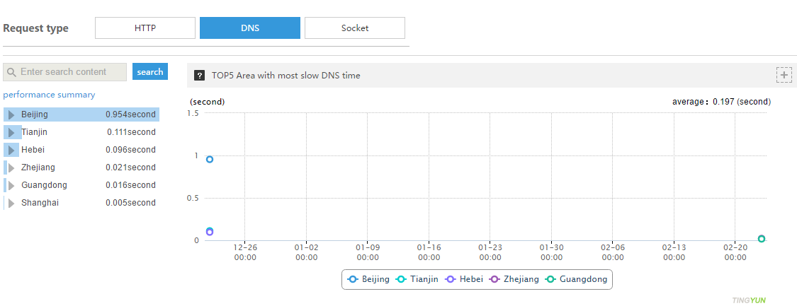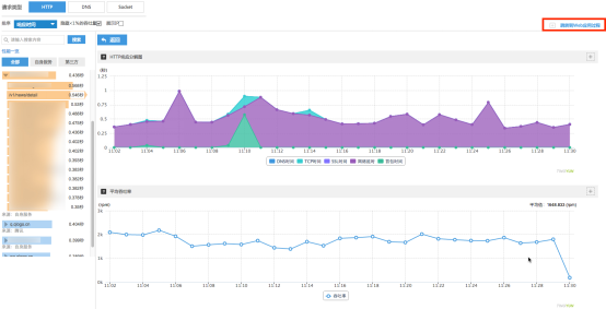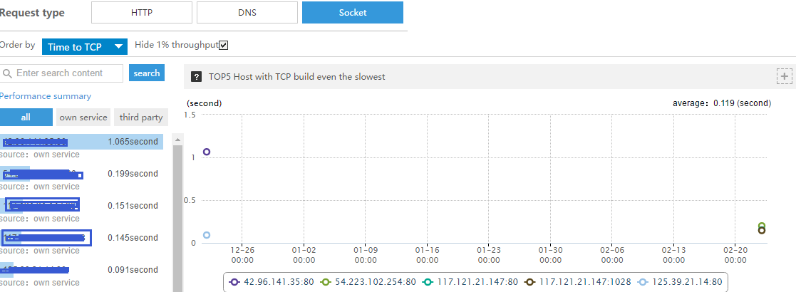 Socket:Производительность Socket анализируется на основе времени TCP-соединения и времени DNS-разрешения. В сочетании с количеством соединений можно определить нестабильность сервера: если в определённый период соединения происходят слишком часто, сервер может быть нестабилен в этот временной интервал.