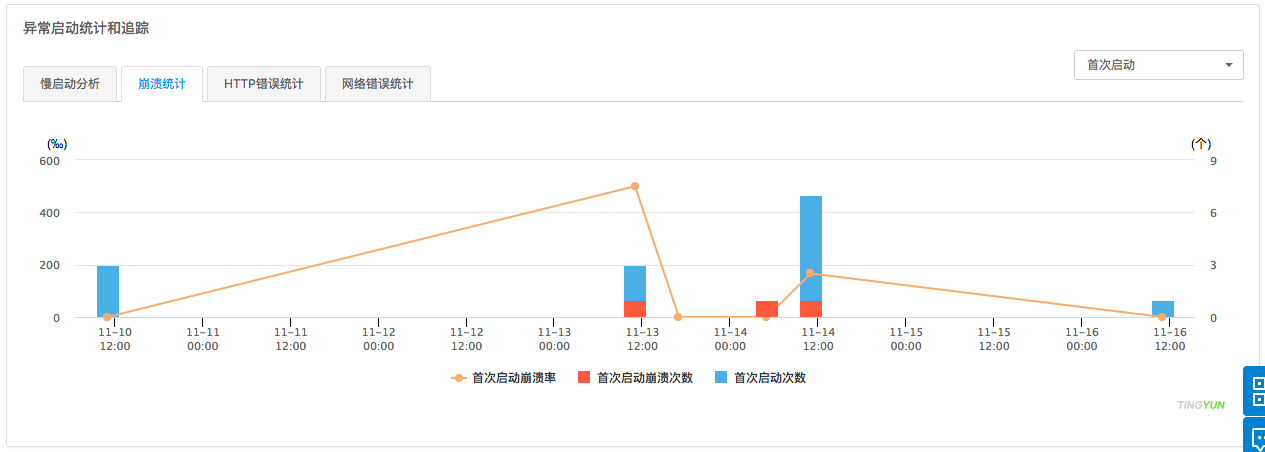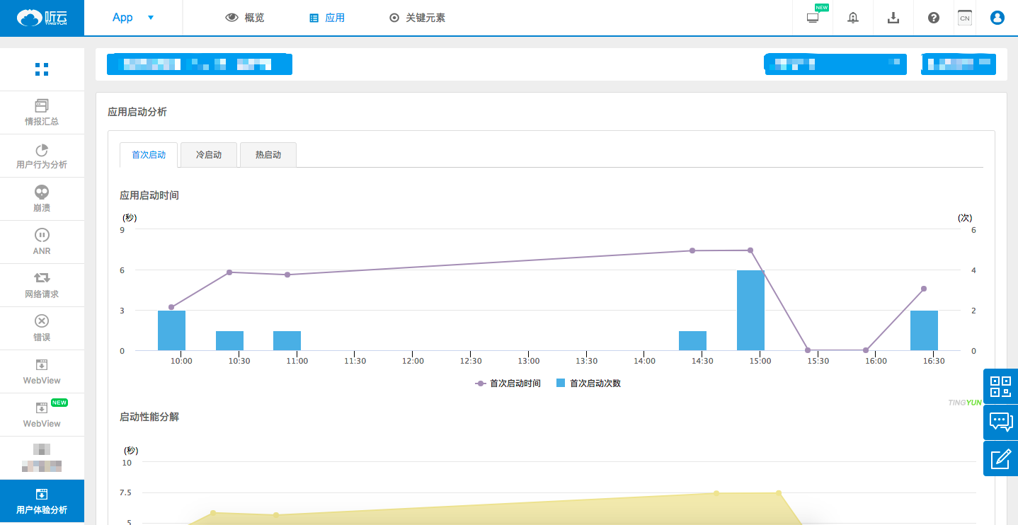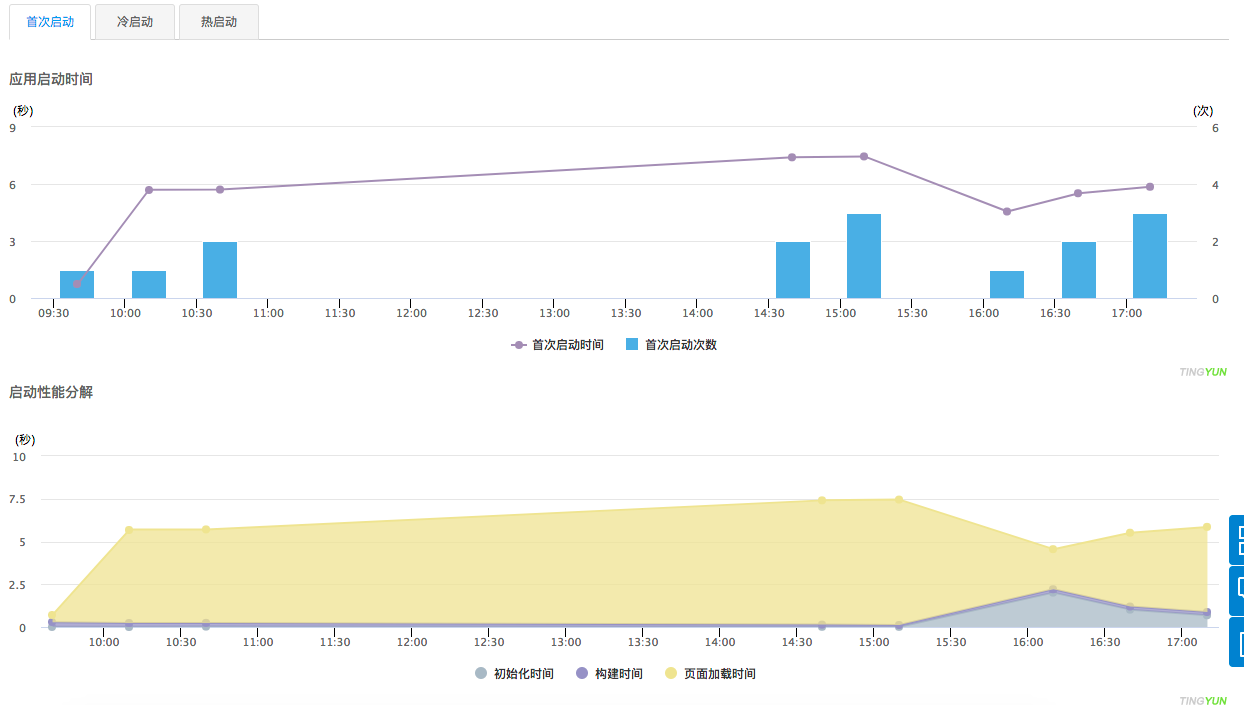 На графике Времени запуска приложения и декомпозиции производительности отображаются время запуска и количество первого запуска, холодного запуска и тёплого запуска, а также разрешение производительности при первом и холодном запусках соответственно, для указанного приложения, версии и временного диапазона.