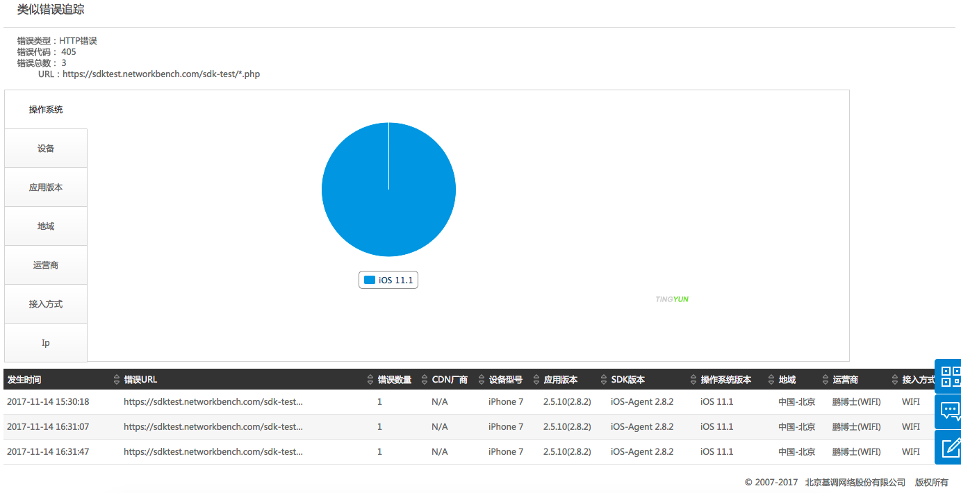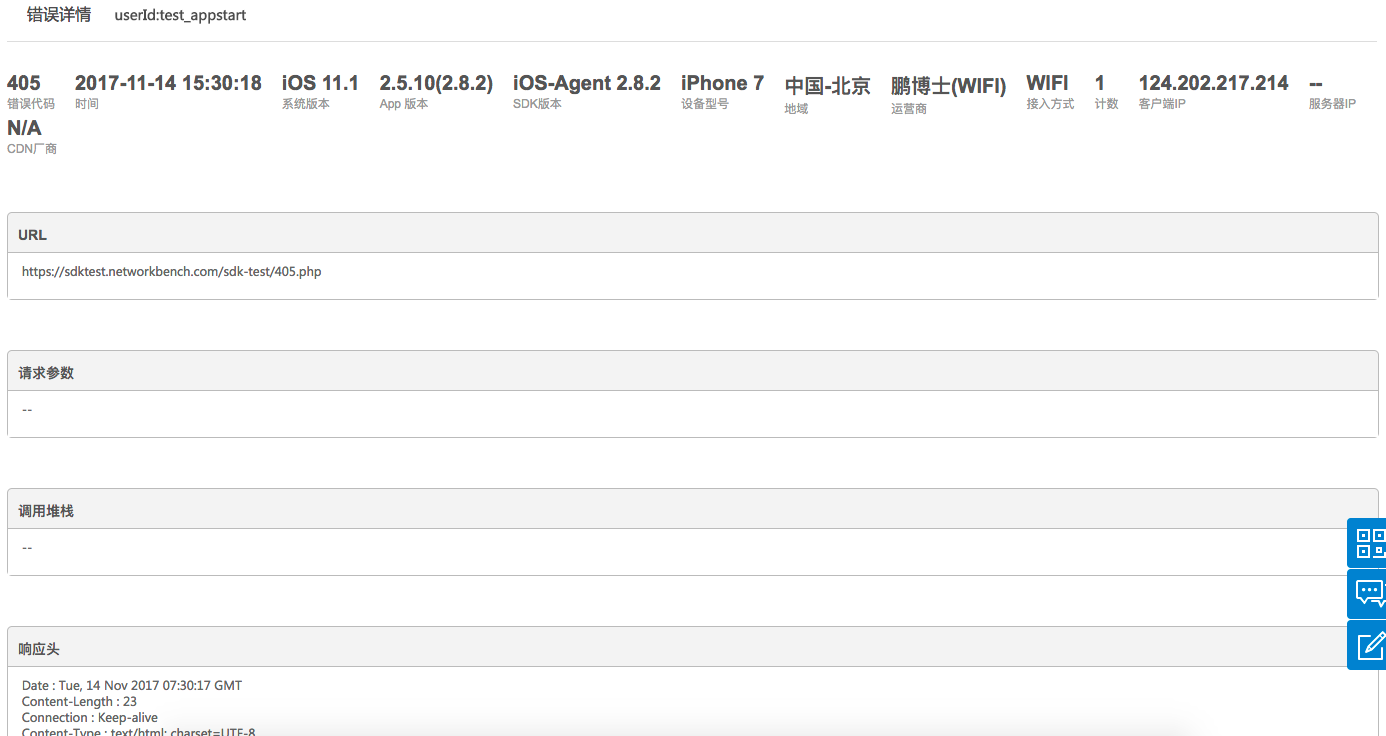 Страница «Детальный Пример Ошибки» включает информацию о конечном пользователе, URL, параметры запроса, стек вызовов, заголовки ответа и содержимое ответа. Информация о конечном пользователе включает код ошибки, время возникновения, версию системы, версию приложения, версию SDK, устройство, регион, оператора, тип подключения, IP-адрес клиента, IP-адрес сервера и поставщика CDN.