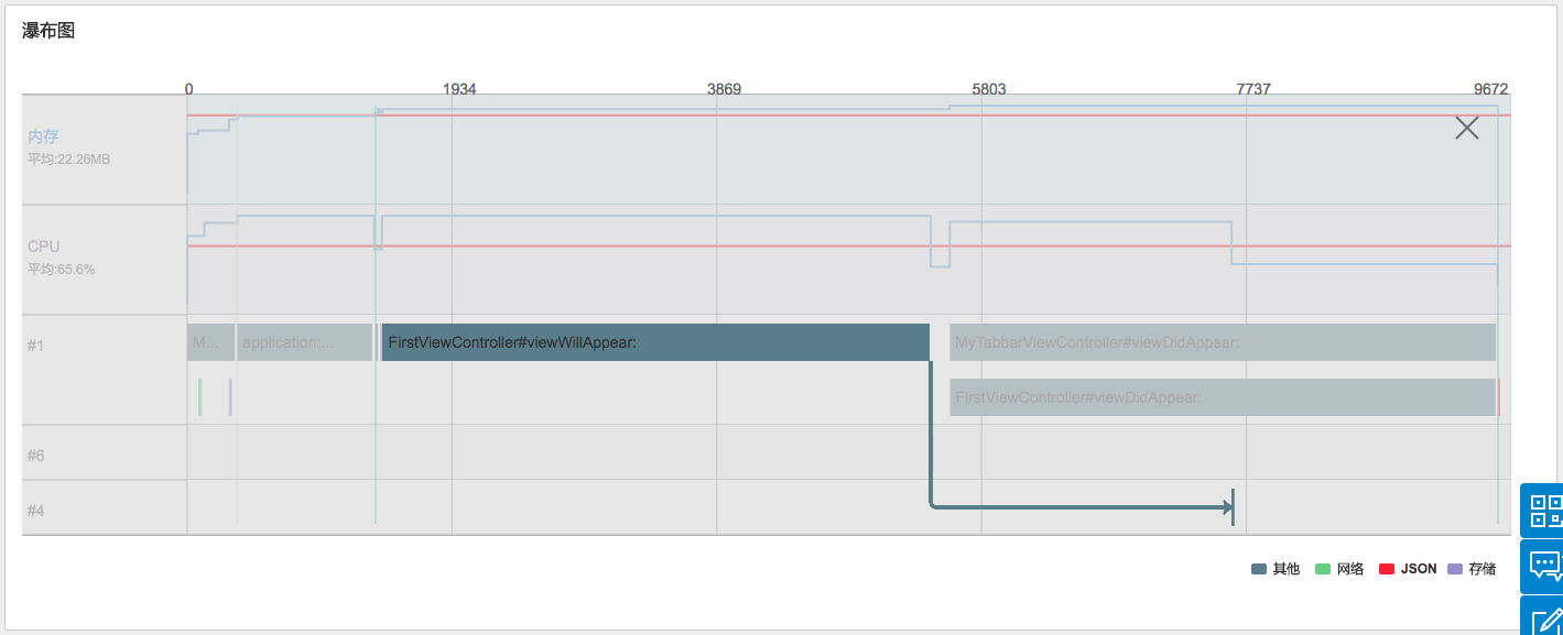 Каскадная декомпозиция включает тенденцию использования CPU, тенденцию использования памяти, методы вызова каждого потока, время выполнения метода, тип метода, отношения вызовов, маркировку ключевого времени медленного запуска. При наведении на пустую область отображаются время, загрузка CPU в этот момент и процент использования памяти. При наведении на область метода отображаются имя метода, время начала, время окончания и затраты времени. Разные методы помечаются разными цветами и делятся на пять категорий: хранилище, изображения, JSON, сеть, пользовательские настройки. При наведении на метод «сеть» отображаются имя метода, URL запроса, время начала, время окончания, код ответа, объём переданных данных, DNS, TCP, SSL, время запроса. Нажмите на отношение вызова метода, чтобы проследить цепочку вызовов этого метода.