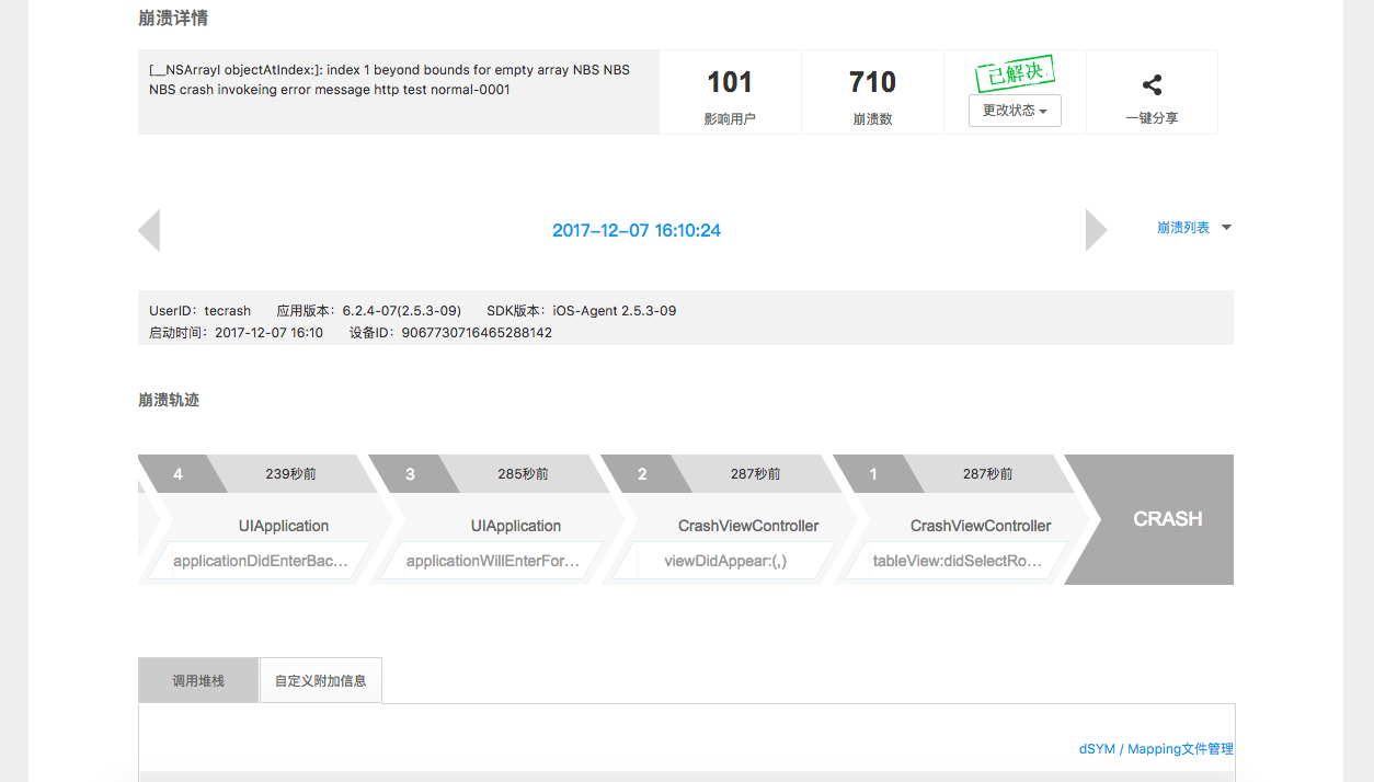 Трассировка сбоев показывает детали первого запуска, холодного запуска и тёплого запуска, включая информацию о сбоях, списки сбоев, трассировки сбоев, стеки вызовов, пользовательские расширения, контекстную информацию и графики. Заголовок страницы показывает сообщение о сбое, затронутых пользователей, число возникновений, статус и поддерживает совместное использование. Список сбоев показывает время запуска, время сбоя, версию приложения, версию системы, устройство, ID пользователя и ID устройства. Контекстная информация включает устройство, остаточную память, загрузку CPU, остаточное пространство устройства, модель CPU, набор инструкций CPU, джейлбрейк, остаточный заряд, GPS, ориентацию UI, оператора и тип подключения. График показывает распределение по версиям приложения и версиям системы.