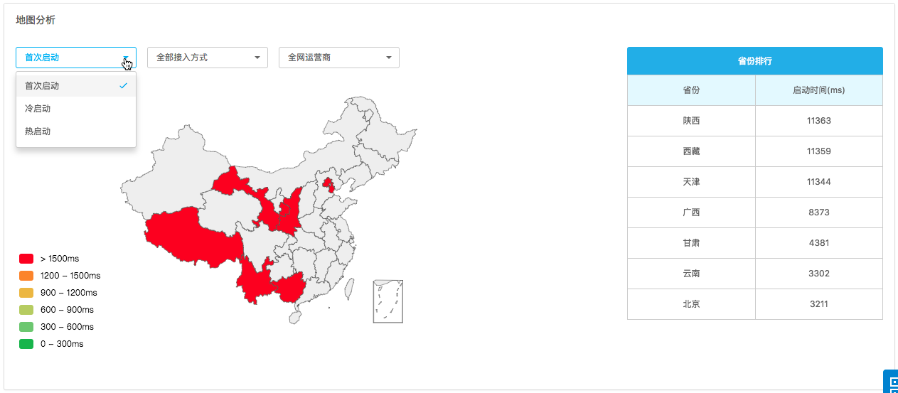 График регионального анализа показывает распределение затрат времени для первого запуска, холодного запуска и тёплого запуска в различных комбинациях регионов, типов подключения и операторов. Типы подключения и операторы поддерживают множественный выбор. Интервалы сегментации рассчитываются на основе настраиваемого порога медленного запуска и делятся на шесть интервалов, обозначенных разными цветами. Например, если порог задан как 3000 мс, интервалы делятся на 0–600, 600–1200, 1200–1800, 1800–2400, 2400–3000, >3000. Рейтинг регионов показывает ТОП10 регионов с максимальными затратами времени для первого запуска, холодного запуска и тёплого запуска.