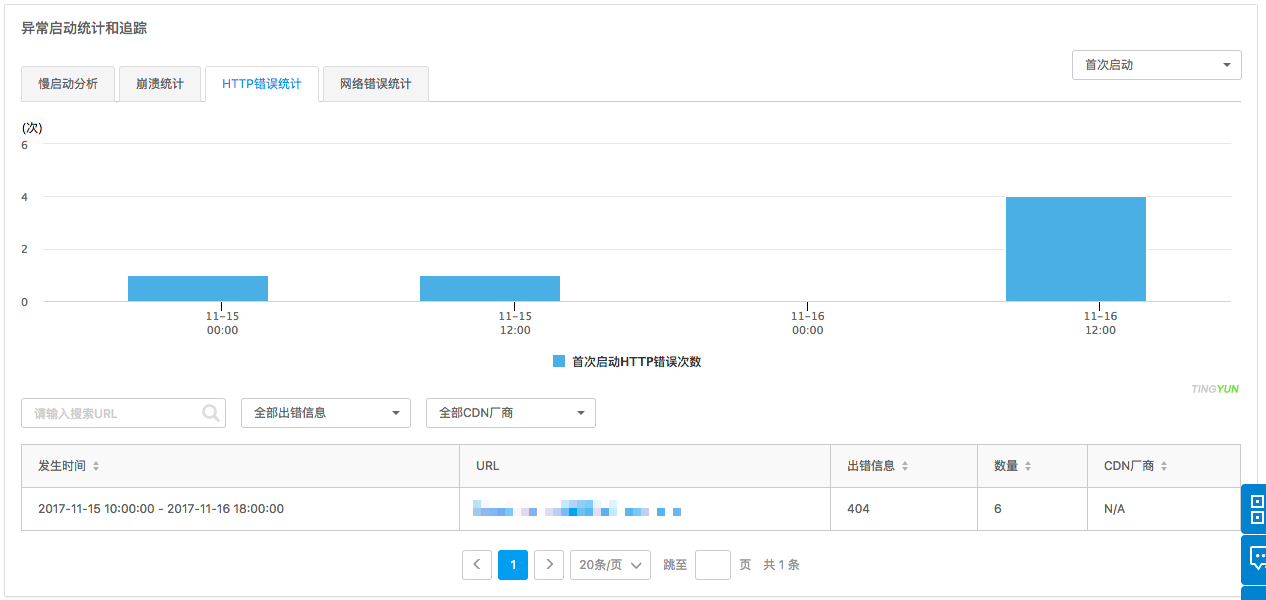 Столбчатая диаграмма показывает количество HTTP-ошибок для процессов первого запуска, холодного запуска и тёплого запуска. Список агрегирует данные по URL и сообщению об ошибке и отображает время возникновения HTTP-ошибки, URL, сообщение об ошибке, количество и поставщика CDN. Список поддерживает поиск по списку URL и фильтрацию по сообщению об ошибке и поставщику CDN (поддерживается одиночный выбор). Нажмите синюю текстовую ссылку в колонке URL, чтобы перейти на страницу «Трассировка HTTP-ошибок» (HTTP Error Trace).