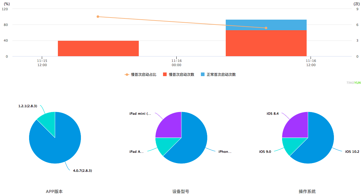 Медленный запуск определяется как запуск, время которого превышает порог; порог по умолчанию — 3000 мс. Столбчатые и линейные диаграммы показывают тенденцию изменения частоты медленных запусков, количества медленных запусков и количества нормальных запусков при первом запуске, холодном запуске и тёплом запуске. Три круговые диаграммы показывают распределение медленных запусков по версиям приложения, устройствам и версиям системы соответственно. Например, ниже показано распределение медленных запусков по версии системы, где iOS 10.2 занимает наибольшую долю, затем iOS 8.4, а iOS 9.0 — наименьшую.