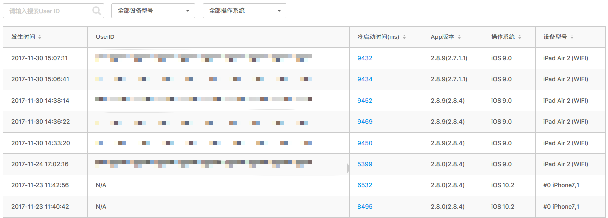 Список отображает время возникновения медленного запуска, ID пользователя, затраты времени, версию приложения, версию системы и устройство. Список поддерживает поиск по ID пользователя и фильтрацию по устройству и версии системы (поддерживается одиночный выбор). Нажмите синюю текстовую ссылку в колонке «Время выполнения» (time-consuming), чтобы перейти на страницу «Трассировка медленного запуска» (Slow Start Trace).