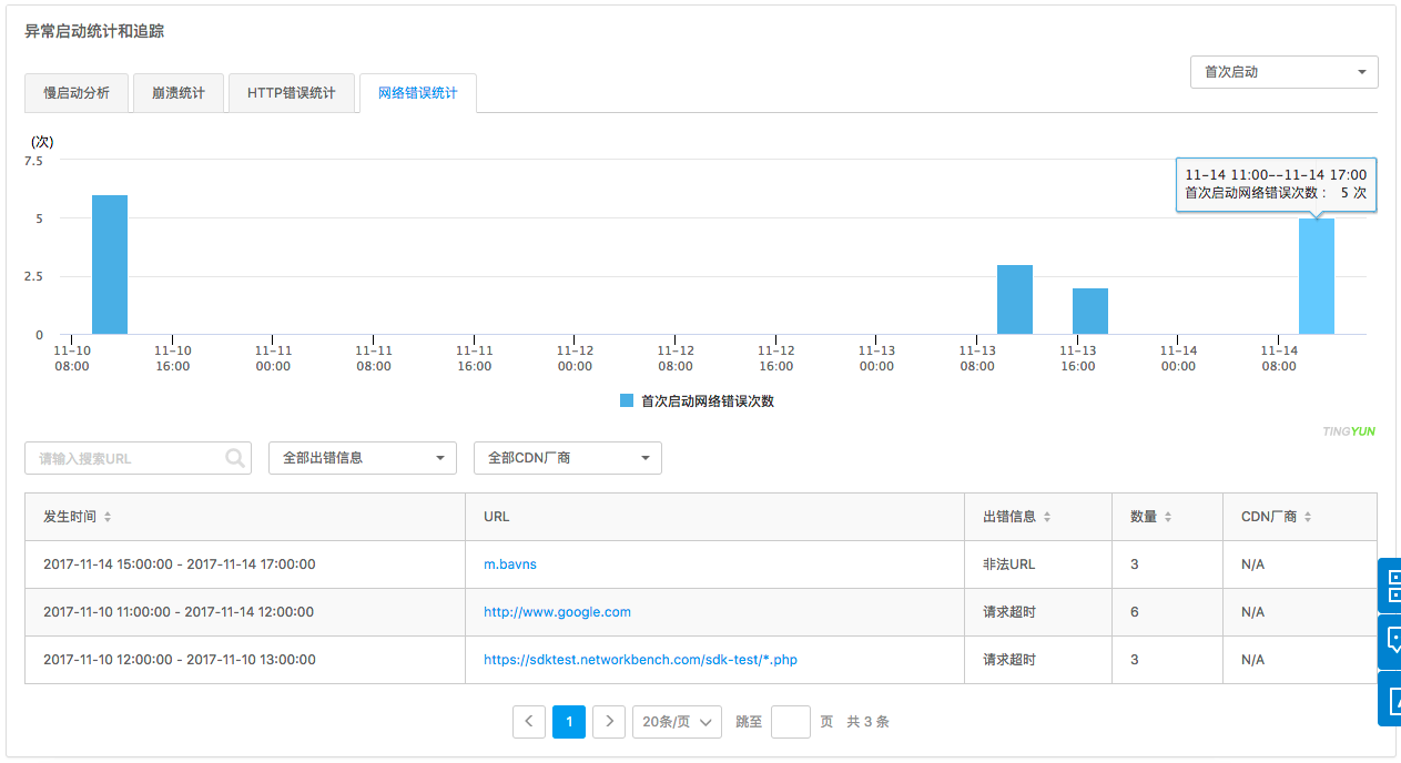 Столбчатая диаграмма показывает количество сетевых ошибок для процессов первого запуска, холодного запуска и тёплого запуска. Список агрегирует данные по URL и сообщению об ошибке и отображает время возникновения сетевой ошибки, URL, сообщение об ошибке, количество и поставщика CDN. Список поддерживает поиск по списку URL и фильтрацию по сообщению об ошибке и поставщику CDN (поддерживается одиночный выбор). Нажмите синюю текстовую ссылку в колонке URL, чтобы перейти на страницу «Трассировка Сетевых Ошибок» (Network Error Trace).