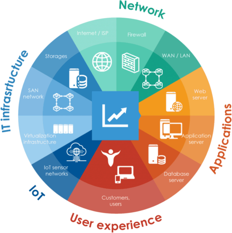 Платформа автоматически выстраивает топологические связи между бизнес-процессами, приложениями и сервисами, визуально выделяет проблемные объекты мониторинга и позволяет непосредственно перейти от проблемного узла к анализу первопричины.